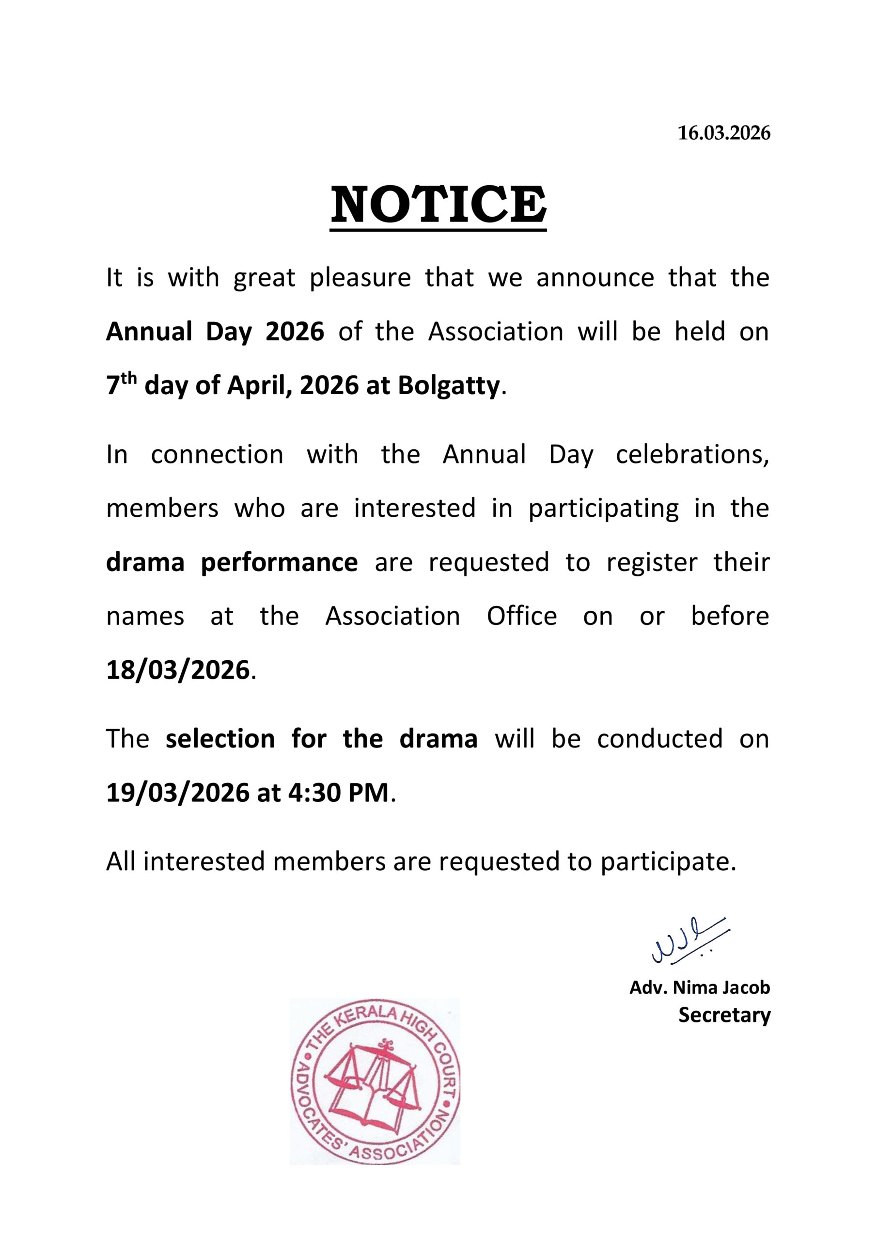 Decision of the General Body Meeting held on 02.03.2026