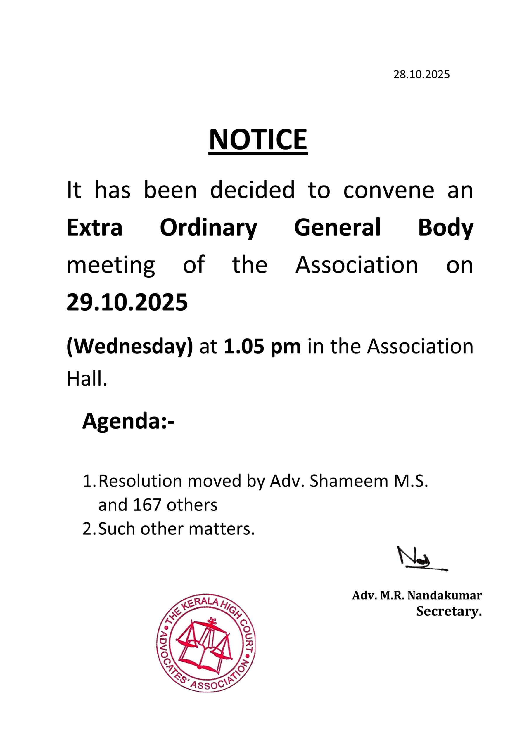 Extra Ordinary General Body on 21.10.2025