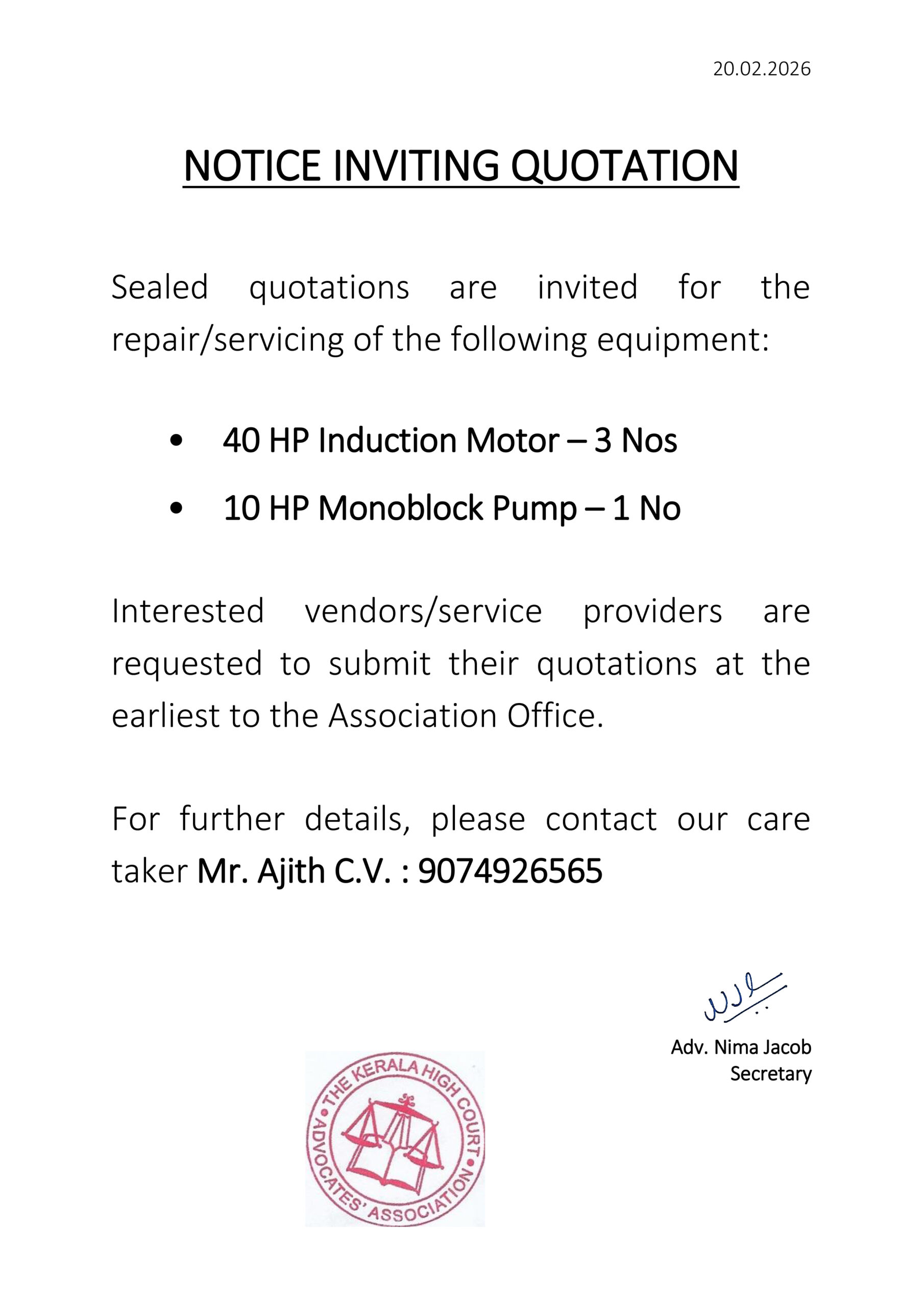 Inviting Quotations : Repair/Service – Induction Motor & Monoblock Pump