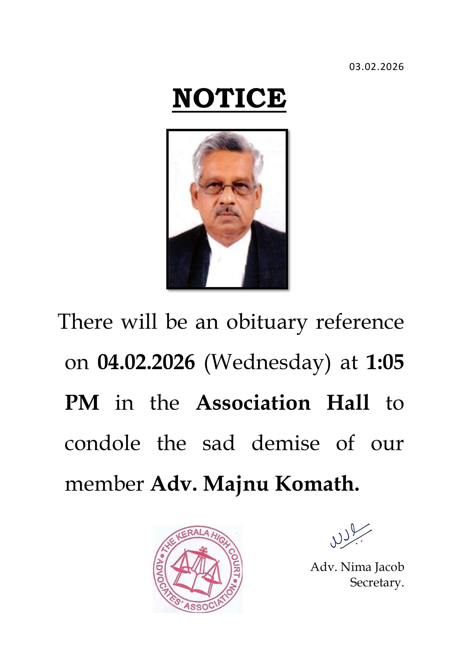 Obituary Reference – Adv. Majnu Komath – 04.02.2026