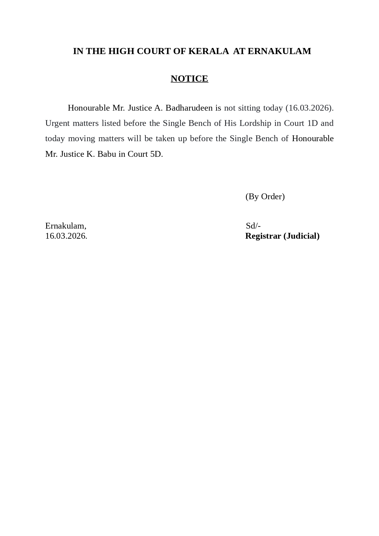 High Court of Kerala – Notification – 16.02.2026