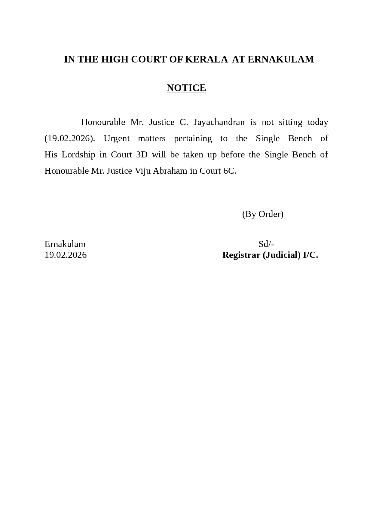 High Court of Kerala – Notification – 16.02.2026